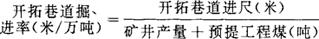 指开拓巷道进尺与矿井产量及预提工程煤量之比。它反映开拓巷道掘进和采煤之间是否相互配合,两者之间的比例关系是否得当。其计算公式为: