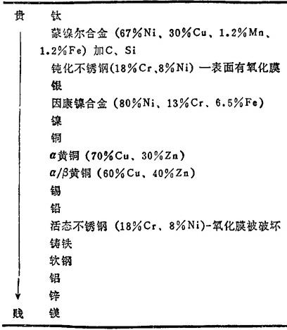 释义 | 异种金属系统的腐蚀 两种不同金属连接在一起(或接触)时,由于电极电位的不同,在液体介质中将分别表现为阳极/阴极,阳极金属(较贱金属)将受到腐蚀,而阴极金属(较贵金属)则不受影响。表2.4-12所示是部分金属材料在海水中的电极电位顺序。当其中两种材料接触时,位于下方的材料呈现为阳极,位于上方的材料为阴极。易于形成钝化膜的材料有铝、钛、不锈钢等,在与其他金属配对时,往往表现为阳极行为。 表2.4-12 几种金属及合金在海水中的电极电位顺序 |