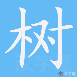 字源解说 “尌”是“樹”的本字。尌,甲骨文 = (木,小树)+ (豆,盛器)+ (又,抓),表示手持木苗栽种在盆子里。造字本义:盆栽木本或草本植物的小苗。金文 将甲骨文的“木” 写成“屮” (草)。篆文 加“木” ,强调种植对象为木本植物。俗体楷书 依据草书字形,将正体楷书中笔画复杂的 简化为“又” 。在甲骨文字形中,“树”表示植树,动词;“木”则表示一棵树,名词。 附 文言版《説文解字》:樹,生植之緫名。从木,尌聲。 ,籀文樹字。 附 白话版《说文解字》:树,播种、培育、种植等农事的总称。字形采用“木”作边旁,采用“尌”作声旁。 ,这是籀文写法的“樹”字。 引申线索