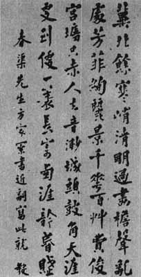释义 | 录宴淸都词轴 【简介】: 现代·向迪琮书。纸本。行书。五行,百三十九字。词作于壬申年(1932)三月三日上巳节,书作当去其时不久。收入《民国时期书法》。 【赏析】: 向迪琮这条行书轴实际上是行楷书,从中可以看出向迪琮的书法所追求的是一种雄伟俊迈之美。他的书法略得苏东坡之饱满,颜眞卿之浑厚,欧阳询之险峻。结字也颇具特色,往往将字的腰部紧缩,横划加以夸张,使得修长的字形,挺拔直立,给人一种雍容大度之感。这条行楷轴中的“冀、画、廔、音、褱、集、宴”等字的结体都具有这种特点。还有字的大小任其自然,比如笔画少的“日、只、去、一”等字,和笔划多的“冀、余、声、麝”等字相比,小者还不足大者的二分之一。这和有的人写笔画少的字时,有意写得大一点,以求同笔画多的字相统一的写法逈然不同。其中少数字的结体接近篆书的结构,但以行楷书的笔法出之,就显得十分自然,而又颇具古意,和整幅作品协调一致,如“花、草、柳、更”等字就是如此。其不足之处,在于有些横画,因起笔太重而形成下倾的过爲明显的三角形结头,有些臃肿之感。然瑕不掩瑜,行楷书写到如此水平,在现代书坛上还是値得称讚的。 |