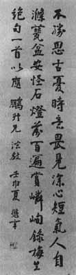 【简介】: 现代·但懋辛书于一九三二年。纸本。行书。七言绝句一首。凡三行,共四十七字。刊于《民国时期书法》(上)。 【赏析】: 淸代的何绍基深痛帖学极滥之风,欲矫行书中欹斜涓舒之病,故云:“余肄书汎滥六朝,仰承庭训,唯以横平竪直四字爲律。”于是开行书中横平之风,可以说是近代尊碑风气在行书中的体现。但懋辛的行书也继承了这一特点,于横画尤加著力,如本幅中的“古”、“忧”、“畏”、“甆”、“百”、“遍”、“辛”等字,都十分强调横画的长而平,起结明显地用顿笔,虽与行书的整体风格似不相契合,然而表现了力度,造成一种朴拙的艺术效果。整篇字虽以行法爲基调,然也兼采楷书笔法,个别字又汲取了草书的结体,如“胜”、“前”等字,表达了作者无意求工、自然流露的创作风貌。而且整体的气势还是协调和融洽的,故不失爲一幅较爲成功的作品。