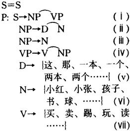 释义 | 形式文法 用于生成语言中的合格句子,并排除不合格句子的一套数目有限的规则的集合。它山初始符号S、非终极符号VN、终极符号VT和改为规则P四个部分组成,记为:G=(VN,VT,S,P)。句子的生成,表现为从初始符号开始,反复应用改写规则,直到得到一个不能再继续改写的终极符号串(string)为止。这个过程叫做推导史,这个终极符号串就是语言中的一个合格的句子。如假定汉语中有如下的文法: G=(VN、VT、S、P) VN={NP、VP、D、N、V} VT={小红、小张、孩子、这、那、一本、一个、两本、两个、买、卖、踢、玩、读、书、球……} 利用这个文法可以生成诸加”小红读书”、”小张买一本书”、”这孩子玩皮球”之类合格的句子。如”小红读书”这个句子的生成过程如下: 按照形式文法的生成力量,可把它们分为四个类型,即*0型文法、*1型文法、*2型文法、*3型文法。每一类型都由它所包含的改写规则来定义。0型是力量最强的,随著数目的递增,力量就越来越受限制。各类型文法之间的关系是:力量较强的文法包含著力量较弱的文法,即能用力量较弱的文法生成的语言,一定能用力量较强的文法生成,反过来就不一定。 |