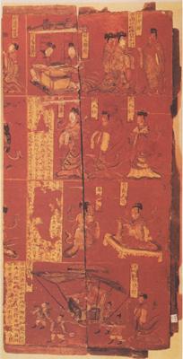 ◎家具/北魏 山西大同北魏司马金龙墓出土 每块长约80厘米 宽约20厘米 厚约2.5厘米 木胎/山西省大同市博物馆藏 ●司马金龙墓出土的漆屏风中,保存较为完整的共有五块,此处所选用的只是尚能拼合成形的第一块与第二块的一个侧面。 这两块漆屏风的制作工艺为:木板板面满髹朱漆为地,以重列式构图分为四层彩绘人物形象。所绘人物取材于汉代刘向所著《列女传》,每个人物旁边均有题记或榜题。画面上均是先在朱地上涂黄漆,而后采用魏碑体墨书题记或榜题,既点明人物身份,又装饰屏风。 漆画中的人物形象以“春蚕吐丝,始终如一”的铁线描勾勒轮廓,而后用黄、白、绿、橙、灰等色漆敷彩成形,其风格和意境与顾恺之的《女史箴图》颇为接近。红漆底色与黑色线条、黄色漆面相衬,图案突出,色彩艳丽;人物器具搭配得当,辅之以题记或榜题,主题突出;铁线描笔法的采用,使人物生动而飘逸。 |