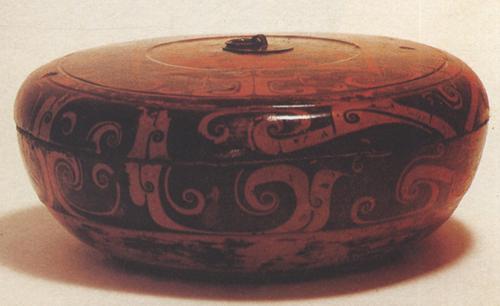 释义 | 彩绘漆盒 ◎容器/战国中期 湖北江陵雨台山遗址297号楚墓出土 口径25.8厘米 通高12厘米 厚木胎/湖北省荆州博物馆藏 ●此盒呈圆形,矮圈足,子口承盖,盖顶正中有一套环鼻形铜纽,盖与身的弧度自然。 该盒系厚木胎旋制而成,盒盖顶部的圆平面和两条圆形纹、矮圈足、盒身下部的圆弧面均是旋制的结果。 该盒内壁满髹朱漆,外壁以黑漆为地,黑地之上饰以红漆和黄漆。盖顶铜纽周围的圆平面与盒身下部的圆弧面,均在黑地上满髹朱漆;盒盖的其余部分和盒身上部,则在黑地上用朱红和金黄色漆彩绘成勾连卷云纹。 黑、红、黄三色搭配合理,静穆中又显热烈。 |