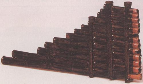 释义 | 彩绘竹胎漆排箫 ◎乐器/战国早期 1978年湖北随州曾侯乙墓出土 长22.5厘米 宽11.7厘米 厚约1厘米 竹胎/湖北省博物馆藏 ●此排箫出土时基本完好,稍有残破,其形状如飞禽展翅之单翼。 制作工艺为:先用单节细竹加工成长短不一的13根箫管,然后按由短到长的次序并列地缠绕在三个竹夹之内。排箫的口沿部分髹朱漆,其余部分均以黑漆为地,上面以朱红、金黄两色漆彩绘绹纹和三角雷纹。 纹饰整齐规范,绹纹和三角雷纹各成纵行,与箫管排列相对应,横向则为绹纹与三角雷纹交错搭配,极具韵律感。该排箫为迄今所知最早的髹漆竹排箫。 |