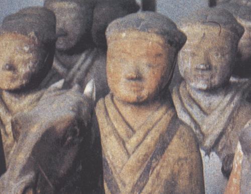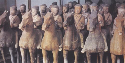◎陶塑/西汉早期 1965年秋陕西咸阳杨家湾村汉墓从葬坑出土 通高50~68厘米 灰陶/陕西省咸阳市博物馆藏 ●杨家湾汉墓系长陵(汉高祖刘邦和皇后吕雉陵)的陪葬墓之一,墓主人可能是西汉文帝、景帝时期(公元前179~前141年)的高级将领。 该墓前发现的10座从葬坑中,南端四座为兵俑坑,出土步兵俑1800多件、舞乐杂役俑100多件;北端六座为骑兵俑坑,出土骑兵俑583件。 此图是骑兵俑中的一部分。 骑兵跨坐于马背,戴头布,穿麻鞋,身著红、白、绿、紫等色短袍(少数身披黑色铠甲),背负弩弓,左手作牵缰勒马状,右手作持兵器状,姿态威武,神情庄重。陶马分黑、红、紫、白等毛色,多数作肃立待命状,少数昂首嘶鸣,身上绘有辔、鞯、后鞧等马具(未见鞍、镫),造型雄健优美,气宇轩昂。 这些骑兵俑在坑内自成方阵,排列严整,表明西汉文、景时期骑兵已构成具有独立战斗力的兵种。其塑制方法和秦始皇陵兵马俑一样,为分段模制与捏塑、彩绘相结合。 |
