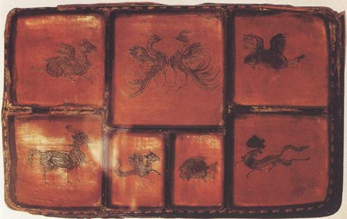 释义 | 彩绘鸟兽鱼纹漆槅 ◎容器/三国·吴 安徽马鞍山朱然墓出土 长25.4厘米 宽16.3厘米 高4.8厘米 木胎、竹、麻布/安徽省文物考古研究所藏 ●此槅面呈长方形,槅内分为七格;槅底的木胎与槅壁的竹胎用竹钉卯合后,再用麻布加固。 边沿和七格间的隔物髹黑漆为地,以朱、绿漆饰成规则的几何纹。槅内七格以朱漆为地,绘出神禽或神兽:上排三格自左至右分别是神鹿、凤鸟和神鱼,下排四格自左至右分别为麒麟、飞廉、双鱼和白虎。神禽、神兽或展翅翱翔,或腾足飞奔,静中见动,神态生动。 丰富的想象辅之以高超的技艺,成就了精美的漆槅纹饰。 |