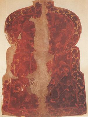 释义 | 彩绘龙纹皮胎漆盾 ◎兵器/战国早期 1952年湖南长沙五里牌遗址406号墓出土 通高64.5厘米 下宽45.5厘米 厚0.7厘米 皮胎/湖南省博物馆藏 ●此盾的制作极具艺术性:上半部形似葫芦,边缘为曲线;下半部状如梯形,边缘为直线,两底角方正;从上至下的中脊隆起,整个盾面呈圆弧形。 皮胎尚好,正面漆膜有残,尤以中脊为甚;背面把手已失,但捆缚把手的嵌银铜鼻犹存。 该盾的正面和背面均以黑漆为地,上面用红色或黄色漆彩绘成各种纹饰。 背面中间为红色蟠龙纹,边缘为红黄两色卷云纹。正面边缘部分以红漆沿边缘形状勾勒出两条各成一体的曲线纹,两纹之间用红漆和黄漆绘出无数卷云纹;中央部分绘有两个近似正方形的框架纹饰,其周围环绕著无数红色或黄色的蟠龙纹。 蟠龙纹周围环绕卷云纹,蟠龙自由翱翔云天;繁缛的蟠龙纹和卷云纹被各成一体的曲线纹和方形框架纹所分割,散乱中又见秩序感;曲线纹和方形纹相衬托,显示出变动的韵律。黑漆地上饰以红黄两色,使画面于幽深沉寂中又见灵动轻盈。该漆盾的制作异常精致,显示出楚文化所特有的浪漫情调。 |
