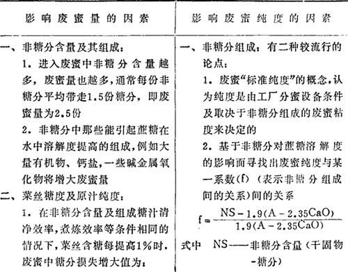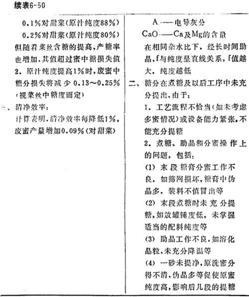 废蜜中糖分损失包括废蜜量及废蜜纯度二个因子在内,表6-50为二者的影响因素。