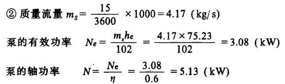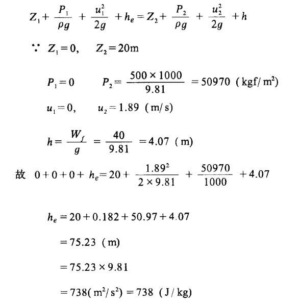 释义 | 往密闭容器输送流体的计算实例 [例]如图2-5-44所示,用泵将水从水池送到高处的密闭容器中,每小时输水量为15m3,输水管的内径为53mm,其出口位于水池水面以上20m,送入压力为500kPa(表压)的容器内。水在管路内的流动阻力为40J/kg。 解: 即泵送每千克水的有效功为738J。 |
