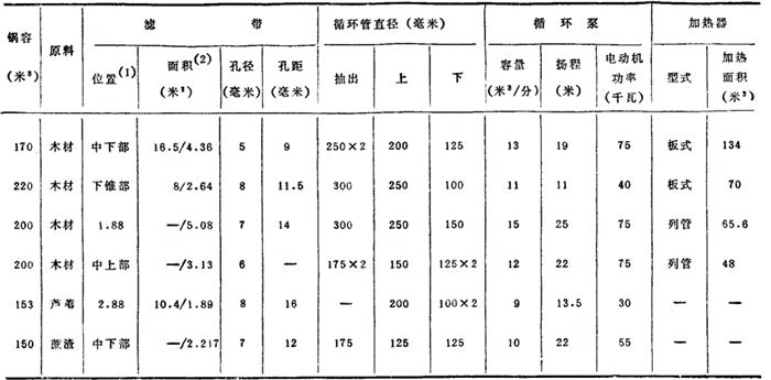 Morterud循环系统的循环管路在锅内,循环泵在锅外。 Brobeck循环系统,蒸煮液由锅下部抽出,经加热器大部分送锅上部,小部分送锅下部。 Schauffelberger循环系统;蒸煮液由锅中上部抽出,经加热器,分两路分别送到锅的上部和底部。 Lurgi循环系统,蒸煮液由锅上部抽出,一部分直接送锅顶部,另一部分经过加热器送锅底部。SO2气体也由泵压送到锅底部。 Rosenblad循环系统;抽液滤网在锅中部,一部分蒸煮液直接送锅底部,一部分蒸煮液经加热器送锅顶部。 Wallin-Svenson循环系统;抽液滤网在锅的下锥部,锅内有管路将蒸煮液送锅顶部,用蒸汽及SO2吹动蒸煮液循环。 气体循环系统,SO2气由锅上部抽出、通过分离器与酸液分离,用压缩机将SO2气压入锅底部。促进锅内蒸煮液循环。 国内各亚硫酸盐制浆厂蒸煮锅循环系统的有关数据列于表6-3-47。 表6-3-47 酸法蒸煮锅循环系统特征  (1)滤带位置以滤带中心线以上的容积对中心线以下的容积之比; (2)分子为滤带面积,分母为孔的面积。 1循环泵 循环泵的容量以每米3锅容取0.05~0.08米3/分。在传统的酸性亚硫酸盐蒸煮时可取下限,而在升温要求比较快的亚硫酸氢盐蒸煮时可取上限。泵的扬程一般为15~20米。 2.加热器 一般采用列管式加热器。为了减轻传热面硫酸钙管垢的沉积,管内液体流速应保持3米/秒左右。每米3锅容需加热面积0.3~0.5米2,视所需升温速度而定。现在有些蒸煮锅已采用板式加热器,只要加强清洗,加热器被硫酸钙沉淀堵塞的情况基本上可被克服。 3.滤带 1米3/分的药液循环量约需滤带面积1.5~2米2,开孔率一般在20~25%之间。滤带位置(滤带中心线上部和下部锅容之比)在不同型式的循环装置上是不一样的。当滤带位置位于锅的下锥部时,在蒸煮后期,特别是在蒸煮禾本科植物时,会发生循环困难。根据金城造纸厂的经验,苇浆蒸煮锅滤带中心线上下锅容之比为2.88较好。目前的趋势是滤带一般布置在圆筒部的下端,此时滤带中心线上下锅容之比接近2。 |