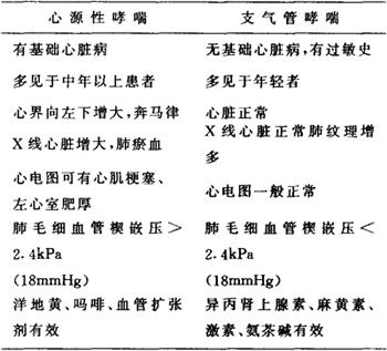 释义 | 心源性哮喘 是指心脏疾病引起病人咳嗽、气喘、咯白色泡沫痰或粉红色痰。 表现为端坐呼吸、发绀、颈静脉怒张。除原有心脏病体征外,两肺可闻及水泡音和哮鸣音。其产生机理:肺瘀血使通气功能下降,心排血量减少使换气功能降低,导致缺氧和二氧化碳潴留。 常见于各种原因所致左心衰竭。 心源性哮喘与支气管哮喘颇相似,但处理不同,所以必须加以鉴别(见下表)。治疗同急性左心衰竭。 心源性哮喘与支气管哮喘的鉴别 |