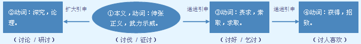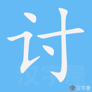 释义 | 讨 1 (討)★★★ 00806名![]() (討) ❶索取,求取。用于口语。 a.常作带宾、带补谓语。 老张头曾打过短工~过饭|他利用工作之便为自己很~了一些便宜|他跑了好几天,一个子儿也没有~到|厂长的日子真不好过,仅仅这个季度甲方就上门~了几次债|他们目前无力偿还债务,你就别去~了。 b.作定语,要带“的”, 两人很要好,~的饭都分着吃。 c.作“准”“许”等动词的宾语。 这个月的生活费要计划着花,不许再来~了。 ❷招惹。用于口语。作带宾谓语,宾语常是非名词性的。可构成兼语词组作谓语。 大家并不欣赏他的表演,可他总想露一手,真是自~没趣|稿子不需要重抄,你偏要重抄一遍,这不是自~苦吃吗?|我可从未~过骂|孩子聪明活泼,又懂礼貌,很~人喜爱|这人总是无事生非,太~人嫌了。 ❸娶。用于口语。 a.作带宾、带补谓语,可构成兼语词组作谓语。 他以前~过老婆,后来离了|他~上了一个好老婆|他~了一个外乡人作老婆。 b.作定语,要带“的”。 他~的老婆是陈家庄人。 【近】 ❶要 ❷招 惹 ❸娶 【词语】 讨伐 讨饭 讨价还价 讨教 讨便宜 讨乞 讨巧 讨俏 讨生活 讨嫌 字源解说 讨,金文 ![]() ![]() ![]() ![]() ![]() ![]() ![]() ![]() ![]() ![]() ![]() ![]() ![]() 附 文言版《説文解字》:討,治也。从言,从寸。 附 白话版《说文解字》:讨,处治不公不义。字形采用“言、寸”会义。 引申线索 ![]() 【字族索引】 寸 【同音字】 tǎo |