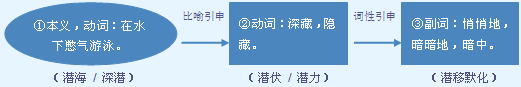 隐没在水中。常作带补谓语。 他的潜水能力很强,一次可以~二三十米远|一位受过特殊训练的人乘微型潜艇~到600米深的水下,进行了一次探测沉船试验|金鱼真好看,一会儿浮出水面,一会~到水底。 【近】 伏 【反】 浮 【词语】 潜藏 潜流 潜热 潜入 潜水 潜水员 潜台词 潜逃 潜艇 潜心 潜行 潜移默化 潜意识 潜泳 潜踪