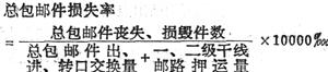 | 释义 | 总包邮件损失率 在总包邮件出口、进口、转口交换量和本局派出的一级干线、二级干线邮路押运班的押运量总件数中,由于处理、运递、保管不当,而发生主要差错、通信事故以及贪污盗窃等所造成的丧失、损毁的件数占总包件数的比重。 丧失指各类邮件总包,在处理、运输、保管过程中发生丢失、被偷窃、抽窃、盗劫的现象。损毁指各类邮件的总包,在处理、运输、保管过程中,由于邮件工作人员及外界人员的过失或灾祸造成总包破损、爆炸、雨淋、水湿、污染、腐蚀、虫蛀、鼠咬、被撕毁、私拆等,使邮件一部或全部失去效用,造成无法投递或赔偿的现象。 计算公式为;