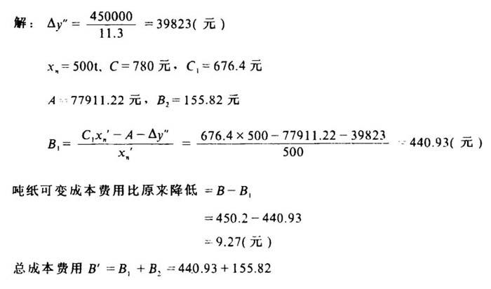 释义 | 总成本费用预测计算 式中 B′——总成本费用(元) B1——可变成本费用(元) B2——不变成本费用(元) [例6]在以上各例中,如果年利润要实现45万元,月均产量500t,吨纸售价760元,吨纸不变费用为155.82元,求可变成本费用和总成本费用。 |