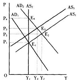 把总需求与总供给结合在一起来分析国民收入与价格水平的决定及其变动的国民收入决定模型。 在附图中,横轴代表国民收入(Y),纵轴代表价格水平(P),AD1代表原来的总需求曲线,AS1代表短期总供给曲线,AS2代表长期总供给曲线。最初,经济在E1点时实现了均衡,均衡的国民收入为Y1,均衡的价格水平为P1。 这时E1点又在长期总供给曲线AS2上,所以,Y1代表充分就业的国民收入水平。 在短期内,政府通过扩张性的财政政策或货币政策,增加了总需求,从而使总需求曲线从AD1向右上方平行地移动到了AD2。 AD2与短期总供给曲线AS1相交于E2。这样,总需求的增加使国民收入水平从Y1增加到Y2,并使价格水平从P1上升到P2。 但是,价格的上升必然引起工资增加,总供给减少,短期总供给曲线从AS1向左上方平行移动到AS3,AS3与AD2相交于E3。这样,国民收入水平从Y2减少到Y3,价格水平从P2上升到P3。在长期中,总供给曲线是一条垂直线(AS2)。AD2与AS2相交于E4,国民收入水平为充分就业的国民收入Y1,而价格水平上升到P4。 这一模型是用总需求来说明国民收入决定的收入-支出模型的发展。它说明,总需求与总供给对国民收入与价格水平的决定都有重要的作用,因此,应该同时运用需求管理与供给管理的政策。 参见“收入-支出模型”、“总需求曲线”、“总供给曲线”。