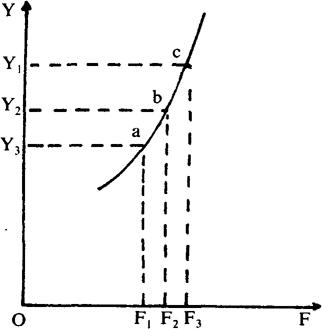 图中,Y表示收入,F表示食物支出,当收入由y1上升到y2时,食物支出由F1上升到F2;当收入由Y2上升到Y3时,食物支出由F2上升到F3,把图中a、b、c……点联结起来,便得出恩格尔食物支出曲线。它的斜率大于1。