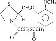 C15H19NO4S2=341.44 CAS-103181-72-2 (±)-3-(巯基乙酰基)-2-[(邻甲氧基苯氧基)甲基]噻唑烷硫代乙酸,S-酯。 Thioacetic acid,S-ester with(±)-3-(mercaptoacetyl)-2-[(o-methoxyphenoxy)methyl]thiazolidine. 乙基硫代酸S-[2-[2-[(2-甲氧苯氧)甲基]-3-噻唑烷基]-2-氧乙代基]酯。 Ethanethioic acid′S-[2-[2-[(2-methoxyphenoxy)-methyl]-3-thiazolidinyl]-2-oxoethyl]ester. 3-乙氧羰基硫代乙酰-2-(邻-甲氧苯氧)-甲基噻唑烷。 3-Ethoxycarbonylthioacetyl-2-(o-methoxyphonoxy)-methylthiazolidine. 粘液溶解药,镇咳药。 Guaisteine,Guaistene. INN,USAN.  |
