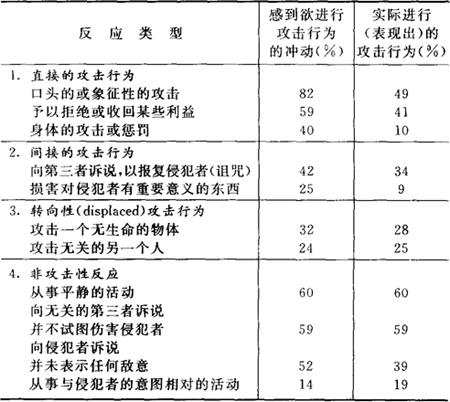 释义 | 愤怒-反应研究 美国社会心理学研究者艾夫里尔1983年发表的一项关于愤怒情绪与行为反应的实验研究。 他对160人在产生愤怒情绪时的行为反应进行调查,发现愤怒与反应之间的关系如表。该研究有助于了解暴力行为发生的心理机制。 (注:表内数字表示个体在感到愤怒的事件中(n=160)想要表现或实际表现出的攻击行为的次数。 如在所有让被试感到愤怒的事件中,82%的次数表示其有进行攻击行为的冲动,而实际实施攻击行为的次数占49%。) |