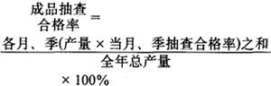 即按随机抽样方法,以一定时期内生产的成品(主要零部件)中,抽选出一定数量的成品(主要零部件)进行检验,其合格品量占抽选总量的比率。对企业的成品或主要零部件进行抽查,一般每月或每季进行一次,每次抽查的品种和数量,由主管部门提出要求,产量多的品种,抽查的数量应多一些。全年的成品抽查合格率计算公式如下: