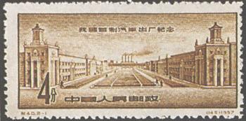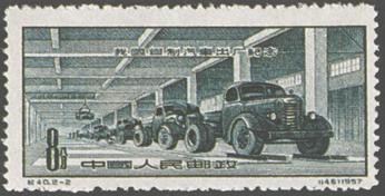 释义 | 我国自制汽车出厂纪念 发行日期:1957年5月1日 齿孔度数:14 印刷版别:雕刻版 图幅:42.5×19 全张枚数:91(7×13) 设计者:刘硕仁 雕刻者:唐霖坤、孔绍惠 印刷:中国近代印刷公司 (1)4分 厂房外景 600万枚 (2)8分 总装配车间 800万枚 (1)-(2) 2枚全 |