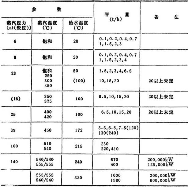 我国习惯上称蒸汽压力在1274kPa(13at)及以下的锅炉为低压锅炉,2450~3822kPa(25~39at)的锅炉为中压锅炉,9800kPa(100at)锅炉为高压锅炉,13720kPa(140at)为超高压锅炉,16660kPa(170at)为亚临界锅炉,22050kPa(225at)为超临界锅炉