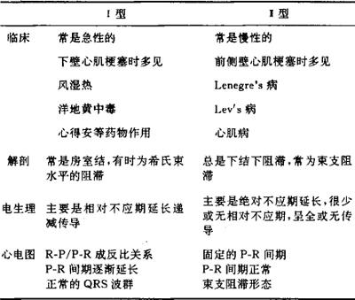 释义 | 房室传导阻滞 房室间传导障碍统称房室传导阻滞(A-VB)。 房室传导过程(即心房内、房室结、房室束以及束支-浦顷野系统传导)中,任何部位的传导阻滞都能引起房室传导阻滞。从解剖生理的角度看,房室结、房室束与束支的近端为传导阻滞的好发部位。 分类 A-VB可分为生理性的与病理性的两大类。生理性传导阻滞:房室传导系统各部位的不应期并无异常,而因自心房下传的激动发生过早或频率过快,当它到达房室交界区时,后者尚处于生理性不应期,从而产生传导延缓或传导中断。 病理性传导阻滞:是由于房室传导系统的应激性病态降低、不应期病态延长所致的传导阻滞,可由传导系统的器质性的或功能性的改变引起。 按阻滞部位常分为房室束分支以上的与分支以下的阻滞两类。 还可按病程分为急性的和慢性的A-VB;慢性的还可分为间断发作型与持续发作型。也可按病因分为先天性的与后天性的房室传导阻滞;或按阻滞程度分为Ⅰ度、Ⅱ度、Ⅲ度;Ⅰ度A-VB传导时间延长,但每个来自心房的激动都下传至心室。 Ⅱ度有部分冲动传导中断,通常又进一步分为莫氏(Mobitz)Ⅰ型和莫氏Ⅱ型。莫氏Ⅰ型也称为文氏(Wenckebach)现象型。Ⅱ度房室阻滞也常称为不完全性房室阻滞。Ⅲ度A-VB则全部冲动传导中断,也称完全性A-VB。 从临床角度看,按阻滞部位和阻滞程度分类不但有利于估计阻滞的病因、病变范围和发展规律,还能指导治疗,因而比较切合临床实际。 病因 引起房室传导阻滞的病因很多,常见的有心肌炎、心肌病、缺血性心脏病和特发性传导阻滞。 既往因风湿热所致的AVB并不少见。 近年来由病毒性心肌炎引起者则日见增多,所致Ⅲ度A-VB多见于青壮年,且90%左右可在住院1周内消失,常见的为房室结水平阻滞,极少转为慢性Ⅲ度A-VB。根据病毒史、转归良好和排除风湿活动便可诊断。在心肌病中,以扩张型心肌病导致Ⅲ度A-VB多见,此类患者有心脏扩大、心功能下降,诊断并不困难。 缺血性心脏病所致Ⅲ度A-VB与特发性传导阻滞最难区别。既往对中老年A-VB的病因考虑冠心病的居多,然冠状动脉造影并未发现异常,从而表明臆测性诊断往往不可靠。 这种原因不明的A-VB可能为特发性传导系统退行性变所致。急性下壁或前壁心肌梗塞,心脏手术引起的传导系统损伤也可引起A-VB。 先天性心脏传导系统缺损少见。另缺氧、电解质紊乱、药物作用(如洋地黄、异搏停等)、甲亢和迷走神经功能亢进等可引起传导系统功能改变。 临床表现 Ⅰ度A-VB者常无症状,听诊时心尖部第一心音减弱,是由于P-R间期延长,心室收缩开始时房室瓣叶接近关闭所致。Ⅱ度A-VB患者可有心脏停跳或心悸感,听诊可发现心音脱漏,脉搏也相应有停搏。心室率缓慢时可有头昏、无力、活动后气促甚至短暂昏厥。Ⅲ度A-VB者,除上述症状外,还可能进一步出现心、脑供血不足的表现,如智力减退、心衰等,特别严重的是当心率过慢、心室起搏点不稳定(往往是房室束分支以下阻滞)或心室停搏(超过15s时)可出现昏厥、抽搐和青紫,即所谓阿-斯综合征发作;如能迅速恢复心室自主心律,发作可立即中止,神志恢复,否则可导致死亡。 听诊时心室率慢而规则(30~50次/min),第一心音强弱不等,由于房室收缩不协调,可闻到“大炮音”及心房音。如右房收缩与三尖瓣关闭同时进行,则颈静脉搏动出现巨大A波。心室率缓慢常引起收缩压升高和脉压增宽,每搏量增大可产生肺动脉瓣区收缩期喷射性杂音和心尖区第3心音。 房室束分支以上阻滞,大多表现为Ⅰ度或Ⅱ度Ⅰ型A-VB,病程一般短暂,少数持续。阻滞的发展与恢复呈逐步演变过程,突发者少见。发展成Ⅲ度时,心室起搏点多在房室束分支以上(QRS形态不变),这些起搏点频率较高,为35~50次/min(先天性房室传导阻滞时可达60次/min),且较稳定可靠,因而患者症状较轻,阿-斯综合征发作少见,死亡率低,预后良好。 房室束分支以下阻滞(三分支阻滞),大多先表现为单支的或双束支的传导阻滞,而房室传导正常。发展为不完全性三分支阻滞时,三少数人仅有交替出现的左束支传导阻滞或右束支传导阻滞而仍然保持正常房室传导,多数则有Ⅰ度、Ⅱ度(Ⅱ型)、高度或Ⅲ度A-VB,下传的心搏仍保持束支传导阻滞的特征。 早期A-VB可间断发生,但阻滞程度的改变大多突然。转为Ⅲ度AVB时,心室起搏点在阻滞部位以下(QRS畸形),频率慢,25~40次/min,且不稳定,症状严重,容易发生心室停搏,阿-斯综合征发作常见,预后差,死亡率高。 1.Ⅰ度A-VB:(1)每个P波后均有QRS波群。 (2)P-R间期延长(成人>0.20s,老年人>0.21s,儿童>0.18s)或超逾相应心率时P-R间期的正常上限值。 此外,同一个人在不同时候描记的心电图上,如果心率没有改变而P-R间期增加0.04s以上,亦应考虑Ⅰ度A-VB的可能。当心率增快时,P-R间期不缩短,反而比原来延长0.04s以上,也应考虑Ⅰ度A-VB。 有时P-R间期明显延长,QRS波群发生较晚,P波可能埋伏于前1个心搏的T波内;偶尔因P-R间期过长,大于P-P的间距,于是在1个QRS波之前有两个P波,第1个是下传P波,引起QRS波群,第2个P波虽然在QRS波群之前,但并不下传,这第1个下传P波称为“跳跃或越过式P波”,常见于同时有Ⅱ度房室传导阻滞时、阵发性室上性心动过速伴有房室传导障碍时。当显著窦性心律不齐伴Ⅰ度A-VB时,P-R间期可随其前的R-P间期的长短而相应地缩短或延长。 2.Ⅱ度A-VB:部分心房激动不能传至心室,一些P波后没有QRS波群