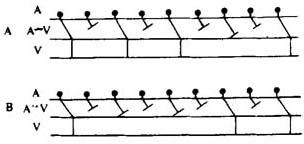 传导组织功能发生障碍时,容易发生隐匿性传导,所以在二度房室传导阻滞时,隐匿性传导比较常见。 可表现如下类型:(1)2∶1房室传导阻滞,可因隐匿性房室传导而变成3∶1或4∶1或更高的房室传导比例。(2)文氏型房室传导阻滞,由于隐匿性传导,可使文氏周期中第一个心搏的P-R间期没有预期的缩短,或文氏周期中的两个P波相继受阻。(3)在高度房室传导阻滞时,隐匿性传导可使连接性逸搏不能按时发放,在相当长的间歇后出现一次室性逸搏。如此造成较长时间的心室停搏,是常见心脏停跳的原因之一。 A:第1~5个心搏其房室传导比值为2:1,从第6~9个心搏其房室传导比值为4:1 B:由于第3、5个激动产生隐匿性传导,使房室传导比值为6:1。  高度房室传导阻滞隐匿性传导使连接区不易发放逸搏代偿,在相当长的间歇后出现一次室性逸搏。 |