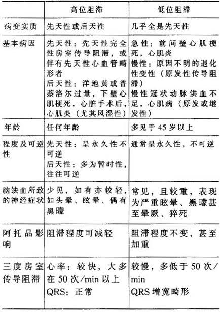 释义 | 房室传导阻滞的定位 房室传导阻滞的准确定位对其临床治疗和判断预后有著重要的意义。 大量研究表明,房室传导阻滞可由传导系统中任何部位(心房内、房室结、希氏束及束支系统)的损害所致。一、二、三度房室传导阻滞可发生于传导系统各个部位,但心房例外,后者除动物实验外,临床上迄今仅证实有一度和二度Ⅰ型传导阻滞。 二度Ⅰ型房室传导阻滞可见于任何部位,而二度Ⅱ型房室传导阻滞几乎无例外地发生于希—浦氏系统中。 决定房室传导阻滞严重性、治疗和预后的,不是心电图类型或程度,而是阻滞发生的部位。 同一种类型的房室传导阻滞发生于不同的部位,预后意义截然不同,而同一部位出现的不同类型的房室传导阻滞,却有著大致相近的预后意义。通常把房室连接区和房内的传导阻滞称为*高位阻滞,希氏束主干和束支系统的传导阻滞称为*低位阻滞。前者病理进展较缓和,预后大都良好,一般无需永久起搏;后者则病变发展快,临床表现凶险,预后恶劣,宜早作永久起搏,故房室传导阻滞的准确定位,也是决定起搏指征的主要依据。房室传导阻滞的无创定位方法包括下列几种:1.根据临床资料定位:大量资料证实,高位阻滞和低位阻滞之间有显著不同的临床特点,根据这些特点作综合分析和随访观察,可以推测阻滞的部位。 高位阻滞和低位阻滞临床特点比较见下表: 引自《心脏传导系统疾病》(黄峻编著,东南大学出版社,1993) 2.根据心电图特征定位:主要观察的项目是:P波的时间和形态;P-R间期的长短和类型;QRS波群的时间及形态;逸搏心律的频率和节律等。(1)一度房室传导阻滞:绝大多数一度房室传导阻滞的阻滞部位位于房室结,发生于希—浦氏系统的阻滞仅占少数。 这与迷走神经对房室结的控制及房室结本身纤维交织的网状结构有利于递减传导有关。 ❷ P-R间期长度:希氏束和束支系统内的阻滞,P-R间期显著延长者很罕见;房内传导阻滞通常仅有P-R间期轻度增加。如P-R间期超过0.30s,往往提示房室结内传导阻滞,或房室结与其他部位的混合性阻滞。 ❸ QRS波群形态:QRS波群形态和时间正常的一度房室传导阻滞可发生于从心房到希—浦氏系统的所有部位,但束支系统的阻滞实际上仅在左、右束支对称性传导延缓,即两束支有同等程度的阻滞时才会出现,这种情况罕见。一度房室传导阻滞伴一侧束支传导阻滞图形,可以有两种情况:第一种是一侧束支传导阻滞伴房室结或房内传导阻滞,即双层阻滞;第二种是双侧束支传导阻滞,但程度不同,冲动沿传导障碍较轻的一侧束支下传,或其中一侧为三度阻滞,另一侧仅传导延缓。 过去认为第二种情况可能性大,近来研究发现,实际上大多数为第一种情况(图形可变,或呈交替性左、右束支传导阻滞图形者例外)。 (2)二度房室传导阻滞:二度房室传导阻滞的阻滞类型及不同部位二度房室传导阻滞的心电图特点见下表: 注:“>”表示不同部位的二度房室传导阻滞出现的相对频率,一个“>”示频率稍多些,三个“>”示显著增多 引自《心脏传导系统疾病》(黄峻编著,东南大学出版社,1993) (3)三度房室传导阻滞:其发生部位依次为束支系统、房室结和希氏束。正确的定位虽有赖于希氏束电图,但体表心电图有时仍可作出大致估计。 不同部位的三度房室传导阻滞心电图特征比较见下表: 引自《心脏传导系统疾病》(黄峻编著,东南大学出版社,1993) 3.根据QRS波形和传导阻滞类型而定位:Dreifus(1977)提出,后经Manatase修改的房室传导阻滞新分类方法,对二度与三度房室传导阻滞的定位颇有帮助。该法依据QRS波群的宽度,将其分为A型房室传导阻滞和B型房室传导阻滞两种,这两型房室传导阻滞有截然不同的临床特点与转归(参见“A型房室传导阻滞”与“B型房室传导阻滞”)。4.房室传导阻滞的希氏束电图定位:房室传导阻滞的准确定位有赖于希氏束电图。其诊断标准参见“房室传导阻滞的希氏束电图定位”。 |