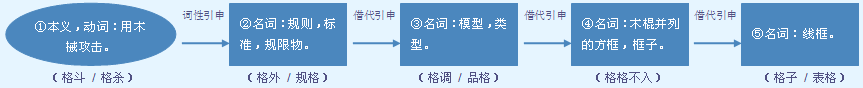 字源解说 各,既是声旁也是形旁,表示进犯。格,有的甲骨文 假借“各”,表示进犯。甲骨 = (各,进犯)+ (亍,行),表示行军作战。有的金文 以“木”代“亍”, = (木,械具)+ (各,进犯),表示用木械进犯、攻击。造字本义:用木械攻击。篆文 承续金文字形。 附 文言版《説文解字》: 格,木長皃。从木,各聲。 附 白话版《说文解字》: 格,树高枝长的样子。字形采用“木”作边旁,采用“各”作声旁。 引申线索