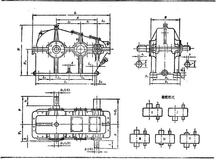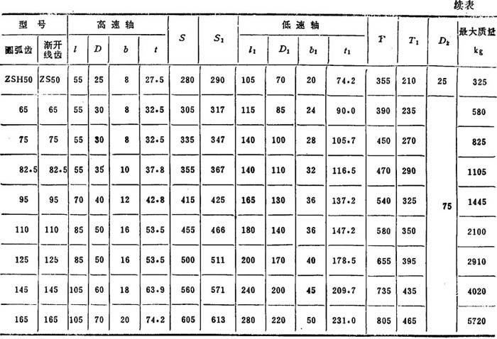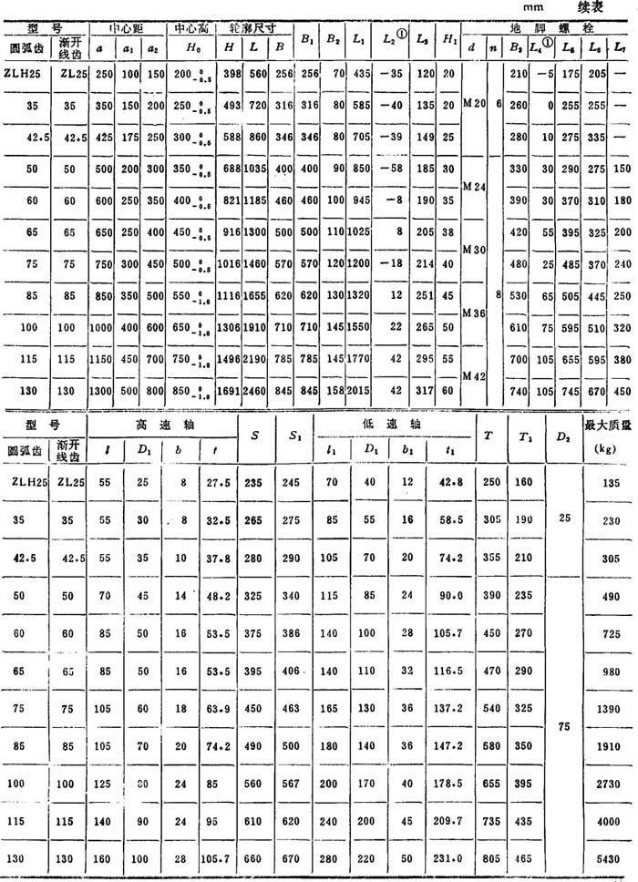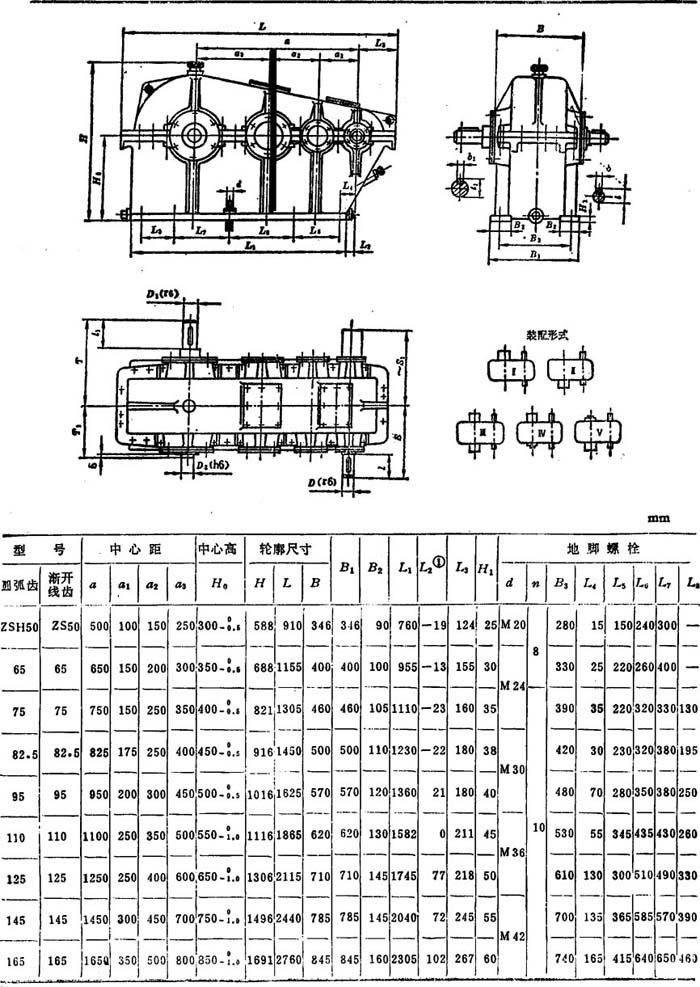 释义 | 技术参数 ZDH、ZLH、ZSH型圆弧圆柱齿轮减速器(JB 1586-75)和ZD、ZL、ZS型渐开线圆柱齿轮(软齿面)减速器(JB 1130-70),适于减速器齿轮圆周速度不大于18m/s、高速轴转速不大于1500r/min、工作环境温度为-40~+45℃的场合使用,可正、反两向运转。 圆弧圆柱齿轮减速器的代号示例: 注: 表6.2-43 ZSH型ZS型减速器外形、安装尺寸及装配形式(摘自JB1586-75,JB1130-70) 注:栏内带负号的尺寸在高速轴轴心线的右侧,不带负号的尺寸位置与图示位置相同。 |