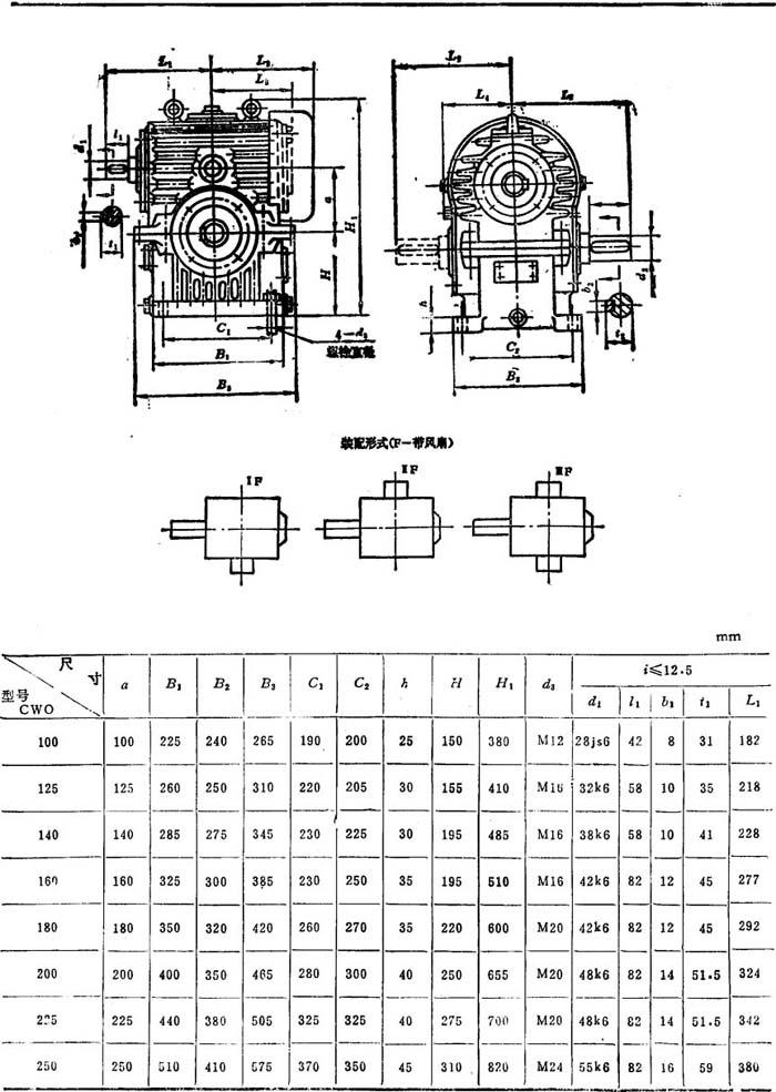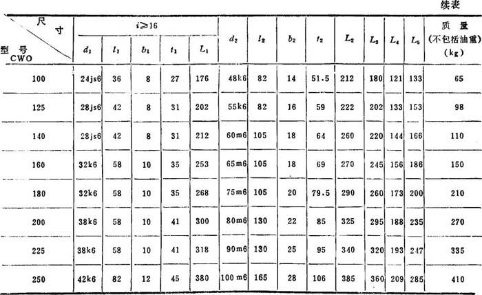 CWU、CWS、CWO三系列的单级圆弧圆柱蜗杆减速器(GB9147-88),适用于蜗杆转速不超过1500r/min、工作环境温度为-40℃~+40℃的场合。当工作环境温度低于0℃时,起动前润滑油必须加温到0℃以上;当工作环境温度高于40℃,必须采取冷却措施。蜗杆轴可正、反向运转。减速器的蜗杆为圆环面包络圆柱蜗杆(ZC1蜗杆)、齿廓C1(见本书第四篇第17章)。