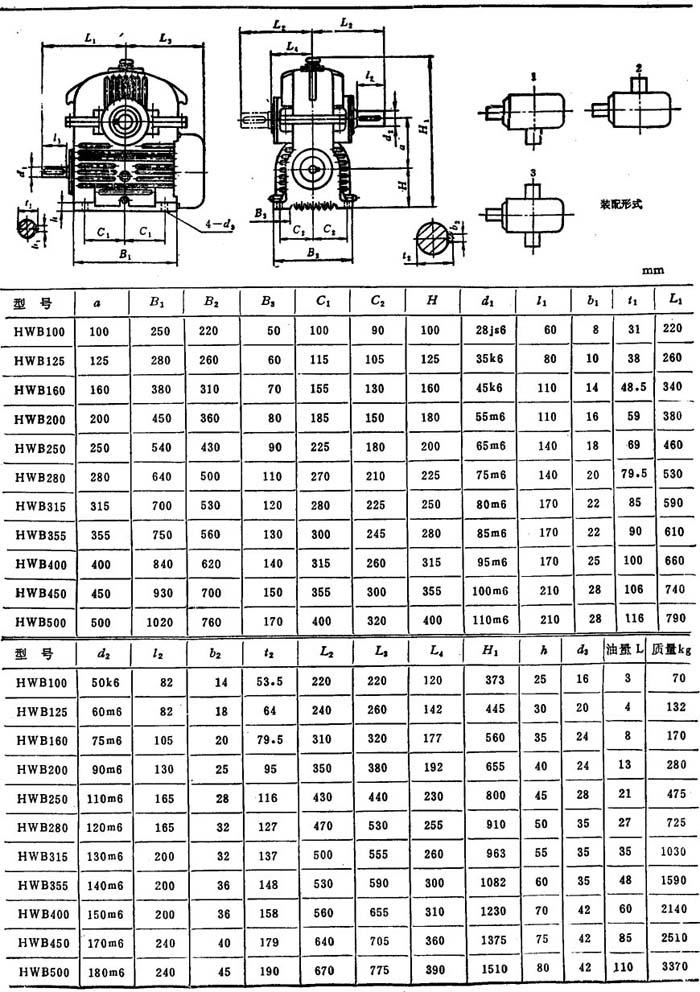 释义 | 技术参数 HWT、HWB型直廓环面蜗杆减速器(GB9148-88),适用于蜗杆转速不超过1500r/min、环境温度0~40℃的场合,蜗杆轴可正、反向运转。如环境温度低于0℃或高于40℃,润滑油应相应加热或冷却。 直廓环面蜗杆减速器代号示例: 表6.3-33 HWT型减速器外形、安装尺寸及装配形式(摘自GB9148-88) |