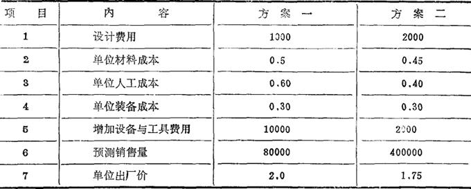 释义 | 技术方案的经济评价 在多个不同的技术性方案都能满足功能要求的情况下,必须通过经济评价来选取最优方案。此时可用“方法篇”和“决策篇”中提供的技术经济分析、决策树等多种方法来进行评价和选优。下面介绍一种比较简便的方案比较法。评价步骤如下: 1.预测为了作比较,对不同设计方案需作一系列的预测: ❶ 设计费用; 表9-10所示,为某产品的两个设计方案有关数据的预测。 表9-10 单位:元 2.根据表9-10数据,用表9-11计算“等位化”指标的比较。 表9-11 单位:元 3.评价。由表9-11可以看出,方案二的单位利润费用低且总利润高,故比第一设计方案更优。 |