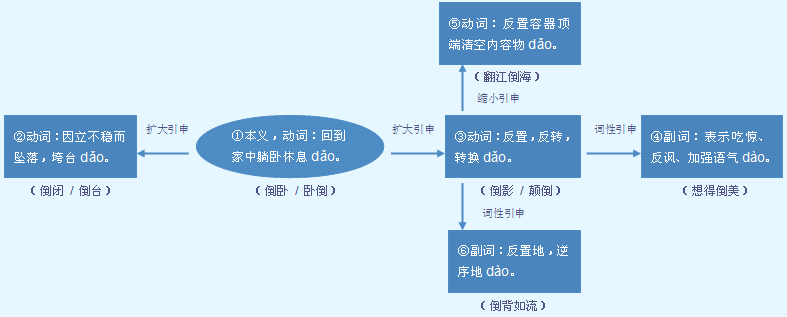 释义 | ![]() ❶ 上下的位置相反: ~悬在空中|他在练习~立|水中的~影异常美丽。 正 zhèng 摆~位置|这幅画你没放~。 ❷ 前后相反: 页码装~了|应从高到低,别~了|这个字笔画写~了。 顺 shùn ~着次序入场|理~纷乱的思绪|应及时理~各业务部门之间的关系。 ❸ 与一般情况相反: ~贴|~插门女婿|你们不要喝~彩。 正 zhèng 树立~面形象|他们是辩论的~方|需要进行拨乱反~。 顺 shùn ~水推舟|这么做才~理成章。 ❶人或竖立的东西躺下来。 a.作带宾、带补谓语,宾语常为施事宾语。 这儿~了几间房,但没有人员伤亡|路上~着两根电线杆|~水里了|~床上|她的身子摇晃了一下,可是没有~下去|~了好几天了|战友们都牺牲了,陆伟也~在这块浸透了鲜血的土地上|一阵枪响,又~下去几个人|老槐树倾斜得厉害,眼看就要~了。 b.作补语。 路面结了一层冰,有几个行人摔~了|由于过度操劳,老人病~了|在黑暗中她碰~了一个花瓶|那堵废墙靠我俩是推不~的。 ❷转移;转换;腾挪。多用于口语。可重叠。常作带宾、带补谓语。 下星期我~早班|~布匹卖|~~手|把粮食~在小屋里|柜里的东西~空了|时间过了,这趟车~不成了|~来了不少山货|~了很多苹果出去|~了半天车|~了两次手|把冰箱~回原来的地方|地方太小,~不开身|明天我有事,咱俩的班能不能~~? 【近】 ❷移 换 挪 【词语】 倒把 倒班 倒板 倒仓 倒车 倒伏 倒戈 倒海翻江 倒换 倒买倒卖 倒嗓 倒手 倒塌 倒台 倒腾 倒替 倒头 倒胃口 倒运 倒账 【注意】 另见dào。 ❶反转或倾斜容器使里面的东西出来;倾倒。常带动态助词“了”“过”。它的搭配对象可以是具体事物,也可以是抽象事物。可用于“把”字句和“被”字句中。 a.作带宾、带补谓语。也可用在连动词组中作谓语。 ~了一杯橘子水|没人~过剩饭|她正对我~着肚子里的委屈|这孩子把半包洗衣粉全~在洗衣机里了|剩菜都被她~掉了|~满了|~干净了|~空了|只有在母亲面前,秀姑才能把心里的话都~出来|爷爷哆哆嗦嗦地从罐子里~出一点茶叶来|碗里都~满了白酒|~了两次茶|垃圾还没有~。 b.作定语,要带“的”。 人口众多的大城市,每天~的垃圾都要论吨计算|你~的时候小心点,别把硫酸溅到手上了。 ❷使向相反的方向移动;后退。可带动态助词“了”“过”。常同表车辆、时间等意义的词语搭配。可重叠。常作带宾、带补谓语。 司机正在~车|把车~在门口就行了|把面包车~进去|把车~了三米远|如果时光能~回去20年,那该多好!|95次列车在这个站要~一次车头|把车再往后~~|这里地方太窄,车很难~。 ❸上下或前后的位置、顺序颠倒。可带动态助词“着”“了”。 a.作谓语,常带趋向补语。也可构成连动词组作谓语。 这个铅字~了|前后两个自然段的顺序~了|包装箱要按箭头指示的方向放,不能~过来|现在他们俩的关系~了过来,原来的领导者成了被领导的|古代的“回文诗”可以~着念|他把那张画~过来看,发现了一处修补过的痕迹。 b.作补语。 登记处把她的名字弄~了,“王俊英”成了“王英俊”|信封上收信人和寄信人的地址写~了|放映员把片子放~了,观众看得莫名其妙。 c.作状语。 他是~数第一名。 ❶表示和常情相反,或跟意料的情况相反。相反的意思较明显时,可以换用“反倒”。用在动词、形容词前面作状语。 她的妹妹~(反倒)比她先出嫁|一个男子汉的胆子~(反倒)不如那些姑娘大|奶奶生病以后饭量~没减少|他的衣服旧了一些,洗得~很干净|十个鸡蛋~有四个臭的。 ❷表示事情不是那样,有不以为然和反说的语气。通常用在主语是第二、三人称的句子里,常同动词“说”“想”“看”、形容词“容易”“好”“轻巧”等搭配。作状语。 他~说得轻松,叫他来试试看!|你想得~美,哪有这么便宜的事?|刚开始万强不知深浅,~把这事看得挺简单。 ❸表示催促或追问,含有祈使或不耐烦的语气。用在动词性词语前作状语。 你~表个态呀!|你~拿个主意出来呀!|你~去不去呀?|你~肯不肯呀? ❹用在复句中,表示转折或让步,常同“虽”“虽然”“可是”“但是”“不过”“就是”等词呼应。作状语。 这孩子虽不是亲生的,~特别孝顺|这种商品的包装虽然不太讲究,质量~还不错|我~听说过他的名字,不过没见过面|大瀑布的风景~值得一看,就是交通太不方便了。 ❺用在谓语前面舒缓语气。可出现在肯定句中,后面限用表示积极意义的词语;也可用于否定句。作状语。 他一个人无牵无挂,~也自得其乐|小陶学习不用大人督促,~挺自觉的|他说这话~不是有意伤害你|爸爸~不反对这件事,妈妈就难说了。 【辨】 (一)倒和倒是:见“倒是”。 (二)倒和却:见“却”。 【近】 〈动〉❷退 ❸反 逆 【反】 〈动〉❸顺 【词语】 倒彩 倒插门 倒春寒 倒车 倒刺 倒打一耙 倒粪 倒好儿 倒虹吸 倒立 倒流 倒屣相迎 倒数(shǔ) 倒数(shù) 倒算 倒贴 倒行逆施 倒叙 倒悬 倒影 倒映 倒置 倒转 【注意】 另见dǎo。 字源解说 “至”是“到”的本字;“到”是“倒”的本字。至,甲骨文 ![]() ![]() ![]() ![]() ![]() ![]() ![]() 附 文言版《説文解字》:倒,仆也。从人,到聲。 附 白话版《说文解字》:倒,身体仆卧在地。字形采用“人”作边旁,采用“到”作声旁。 引申线索 ![]() 【字族索引】 到 【同音字】 dǎo dào |