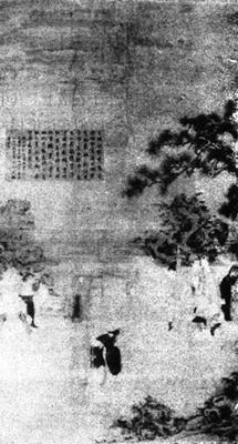 【作品赏析】: 《折槛图》画的是汉代朱云冒死向皇帝进谏的故事。 画中环境是宫内庭院,有山石苍松,朱槛(栏杆)环绕。汉成帝坐椅上,宠臣张禹执笏立于帝侧,皇帝身后有宫女、侍臣。左边朱云攀槛而立,两个腰佩利斧的武士,正用力拖拽,中间躬身欲拜的是辛庆忌。 汉成帝的老师,丞相张禹专权误国,但深受汉成帝宠信。 忠君爱国的朱云,冒死进谏,请求皇帝赐给他尚方斩马剑,以斩张禹。成帝听了大怒,命武士把朱云拖出斩首。朱云紧紧拉住栏杆不去,栏杆被他拉断。他申说,我死后可以同历代忠臣相游于地府,心愿已足,但你的朝廷怎么办?左将军辛庆忌摘下官帽、绶印,下拜叩头直到流血,以性命力保。 汉成帝终于赦免了朱云,而且吩咐宫中不要换掉栏杆,只可将折断的栏杆加以修整,以表彰朱云忠贞耿直、犯颜直谏的功勋。 作者描绘了处于尖锐冲突中的几个人物的性格和感情的对立,很准确地抓住他们不同的地位和他们之间的联系。画法工整谨严,当是画院内画家的作品。。  宋人 轴 绢本设色 纵173.9厘米 横101.8厘米 藏台北故宫博物院(另本藏徐悲鸿纪念馆) |