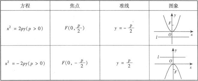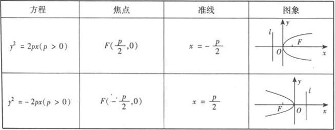 取经过焦点F且垂直于准线l的直线为x轴,x轴与l相交于点K,以线段KF的垂直平分线为y轴,如图,设|KF|=p,那么焦点F的坐标为( ,0),准线l的方程为l∶ 设抛物线上的点M(x,y)到l的距离为d,且 ,则抛物线的方程是y2=2px(p>0),上述方程称为抛物线的标准方程,它表示的抛物线的焦点在x轴的正半轴上,坐标是( ,0),它的准线方程是 .  一条抛物线,由于它在坐标平面上的位置不同,方程也不同,所以抛物线还有其他几种形式,它们的标准方程、焦点坐标、准线方程及图形见下表.   |