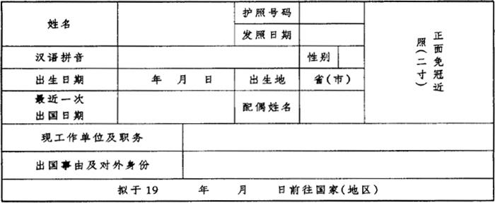 【简介】: 护照,即是由主权国家发给本国公民出入国境,去外国办理外交事务,或旅游、留学、讲学、考察、居住等,以证实其国籍和身份的凭证性涉外文书。 护照的填写是由两个部分组成: (一)填写“出国人员卡片” “出国人员卡片”是由申请护照的出国人员填写。它有14个栏目,包括姓名、护照号码、发照日期、汉语拼音、性别、出生日期、出生地、最近一次出国日期、配偶姓名、现工作单位及职务、出国事由及对外身份、拟出国日期、前往国家(地区)和照片。 (二)填写护照 护照的填写,也是按照印好的护照各栏目填写。其中有的栏目,如持照人、性别、出生年月日及持照人签名等是由申请出国人员自己填写;有的栏目是由发护照的机关工作人员填写;另有个别栏目如“签证”栏则由出入国签证机关填写或盖章。 【范例】: “出国人员卡片”样式  “护照”样式:           出国人员卡片  “护照”样式