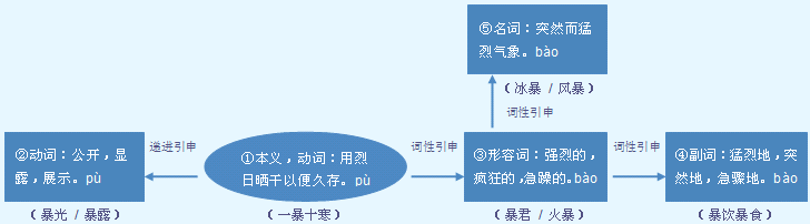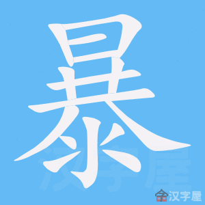 释义 | ![]() 古同“曝” ❶突然而猛烈。 a.作定语,常用于固定词组中。 ~风骤雨。 b.作单音节动词或形容词的状语。 ~饮~食|要避免~晒|江水~涨|连阴之后,春阳~暖。 ❷凶狠,残酷;急躁。可受程度副词修饰。 a.作谓语,能带程度补语。 你的性子也太~了一点|他的脾气~得很。 b.作状语。 横征~敛|那蛮横的队长~跳着说着什么|母亲突然~怒起来。 c.作定语。 瞧他那~脾气,多不好。 d.用在某些单音节动词后作宾语。 除~安良|防~措施。 鼓起,突出;糟蹋,残害。常作带宾、带补谓语。 以强凌弱,以众~寡|~尸荒野|他腿上的青筋一根根都~出来了|自~自弃。 【近】 〈形〉❶猛 ❷躁 烈 【词语】 暴病 暴跌 暴风雪 暴风雨 暴风骤雨 暴富 暴虎冯河 暴君 暴雷 暴力 暴利 暴戾 暴烈 暴殄天物 暴跳如雷 暴徒 暴雨 暴政 暴卒 字源解说 暴,甲骨文 ![]() ![]() ![]() ![]() ![]() ![]() ![]() ![]() ![]() ![]() ![]() ![]() ![]() ![]() ![]() ![]() ![]() ![]() ![]() ![]() ![]() 附 白话版《说文解字》: 暴,照晒。字形采用“日、出、収、米”四形会义。 引申线索 ![]() 【字族索引】 暴 【同音字】 bào pù |
