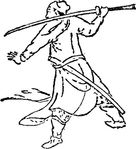 传统刀术动作。明程宗猷《耕余剩技》“单刀说”载:“将刀横放右肩,前手偏垂于左,特露出左手里腹肋,诱彼枪扎入,用左肘往右横垫开枪,左右两脚斜跳而入,随加左手共持刀把砍杀。”