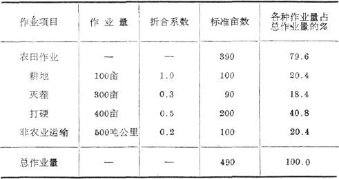 释义 | 拖拉机作业量 反映拖拉机在一定时期内进行生产作业总成果的指标。 拖拉机是农业生产的主要动力,能完成多种作业,为了便于汇总和比较,各种作业要折成标准耕熟地的作业量。标准耕熟地的作业量单位称为折熟亩或标准亩。在实际统计工作中,规定有统一的折合系数——标准亩折合系数。 例如,有东方红一54型一台,在1982年10月的工作情况:耕地100亩,灭茬300亩,打硬400亩,非农业运输500吨公里。 该东方红-54型10月份的总作业量的计算如下: 从上表可看出东方红-54型10月份完成各项作业占总作业量的百分比,表明农田作业和非农业运输的情况。 |