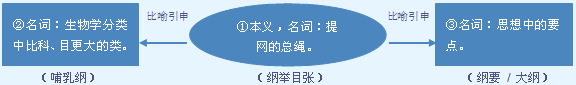 提网的总绳。比喻事物的关键部分;要领: 总~|~领|提~挈领。 目 mù 条~|纲举~张。 ★ “目”是鱼网的孔眼,比喻大项之下小的项或事物的具体部分。