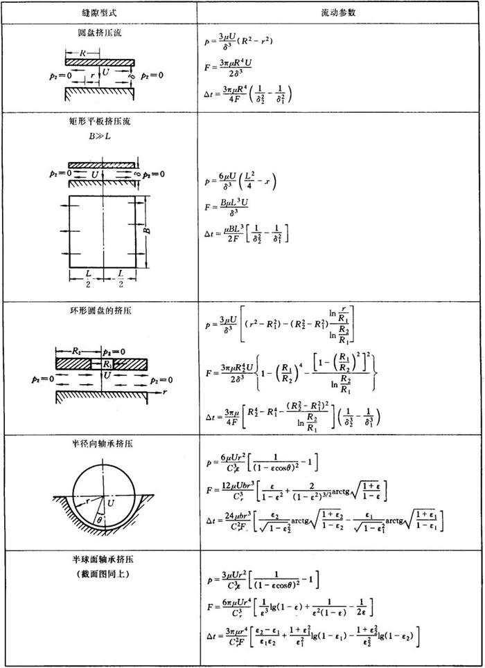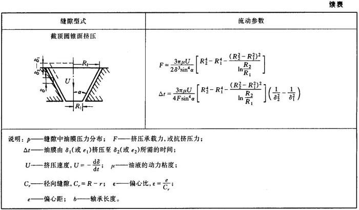 当摩擦副受到周期性的冲击负载时,缝隙内的油膜受挤压而减小,与此同时产生一抗挤压力,它们的计算公式见表1.4-7。