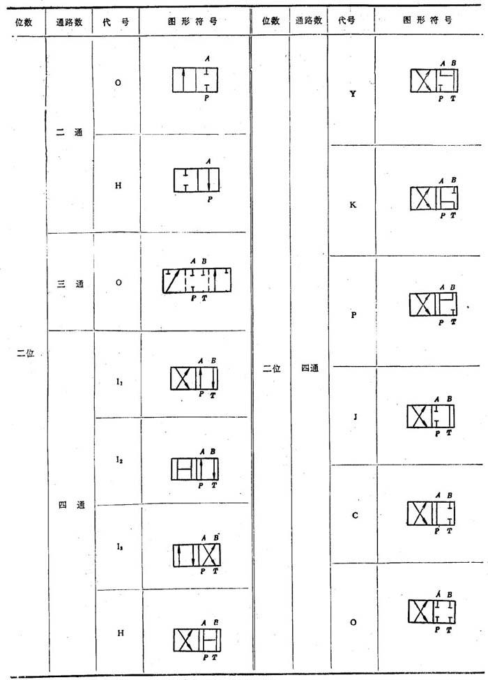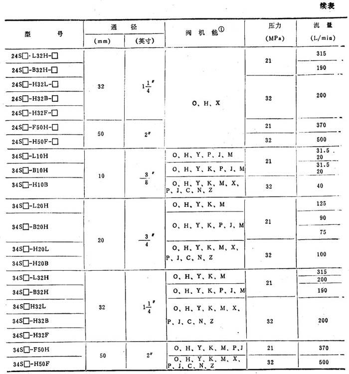 释义 | 换向阀系列及其技术参数 电磁换向阀、电液换向阀、手动换向阀系列及其技术参数见表7.6-9~7.6-12,型号意义分别说明如下。 表7.6-9 电磁换向阀技术参数 注, 电磁换向阀: 例:34DO-B6CTZ ❶ 工作位置数:2为二位;3为三位❷ 通油路数:2为二通;3为三通;4为四通 ❸ 电磁铁类型:D为干式交流型;D1为湿式交流型;E为干式直流型;E1为湿式直流型 ❹ 阀的机能:见表7.6-7、7.6-8❺ 板式连接:代号为B❻ 通径:mm ❼ 压力等级:H为21MPa;C为14MPa❽ 复位形式:T为弹簧复位或弹簧对中;无标记为无弹簧 ❾ 是否带阻尼调节:无标记为不带;Z为单阻尼调节;ZZ为双阻尼调节。 电液换向阀: 例:34DYO-H16B-TCZT1 ❶ 工作位数:2为二位;3为三位❷ 通油路数:4为四通 ❸ 电磁铁类型:D1为干式交流型;D2为湿式交流型;E1为干式直流型;E2为湿式直流型 ❹ 液动控制:代号为Y❺ 主阀机能:详见表7.6-10❻ 压力等级:32MPa代号为H❼ 通径:mm ❽ 连接形式:B为板式连接;F为法兰连接❾ 有无弹簧:无标记为无弹簧;T为弹簧对中❿ 行程调节:无标记为无行程调节机构;C为带行程调节机构 ⑾阻尼器:无标记为无阻尼器;Z为单阻尼器;ZZ为双阻尼器 ⑿二位四通先导阀机能:详见表7.6-7 手动换向阀: 例:24SO-L10H-T ❶ 工作位置数:2为两位;3为三位❷ 通油路数❸ 控制方式:手动为S❹ 阀机能;由需要选定,见表7.6-7、7.6-8❺ 连接形式:L为螺纹连接;B为板式连接;F为法兰连接❻ 通径:mm❼ 压力:21MPa代号为G(但表7.6-12中写成H)❽ 结构代号:T为弹簧复位;W为钢球定位 联合设计型: 例:24SO-H10B-T ❶ 工作位置:2为两位;3为三位❷ 通油路数❸ 控制方式为手动❹ 阀机能❺ 压力:32MPa,代号为H❻ 通径:mm ❼ 连接方式:L为螺纹连接;B为板式连接;F为法兰连接❽ 结构代号:T为弹簧复位;W为钢球定位 表7.6-7 弹簧复位二位二通和二位四通换向阀的机能 |
