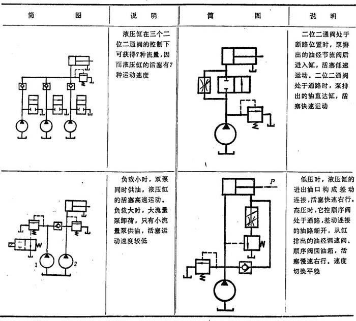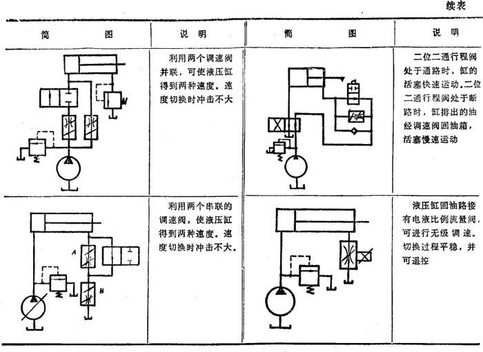 换速回路又称速度换接回路,见表7.8-10。这种回路可使缸的活塞在运动过程中有两种或两种以上的不同速度。