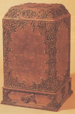 ◎佛教冥器/北宋 浙江瑞安慧光塔出土 底宽24.5厘米 高41.2厘米 木胎、漆灰、金粉、珍珠/浙江省博物馆藏 ●此函整体造型呈立方体,盖为盝顶。 通体髹棕色漆,棕地上或以堆漆法饰出菊花缠枝纹,或以描金(又名泥金画漆,即在漆地上以金粉装饰图案)工艺绘出人物图案。函盖盝顶部分用棕色漆堆出缠枝菊花图案,点缀小珍珠作饰物;函盖立墙周边的髹饰工艺同上;函底座四角用棕色漆堆出菊花缠枝纹,中间壶门内堆出形态各异的神兽。函盖四面立墙用金粉绘出白描人物画各一幅:其中一幅的画面中,舍利佛居中合十而立,由众金刚、飞天侍奉,云气飘浮于周围,既庄严又飘逸;左右两幅画对称布局,每幅均表现梵天、帝释、善男信女礼佛的情景,其恭敬神态溢于画面;另外一幅为金刚肃立、乐器环列的礼乐图,令人如闻缥缈仙乐。四幅图尽管各自独立,但内容一致,连缀起来就是佛光普照、万灵礼佛之意。 |