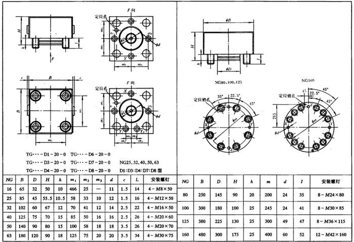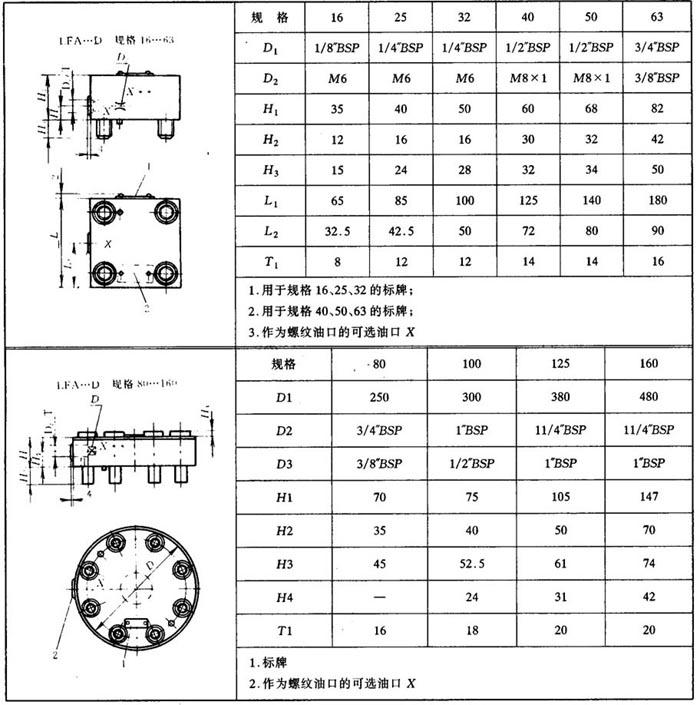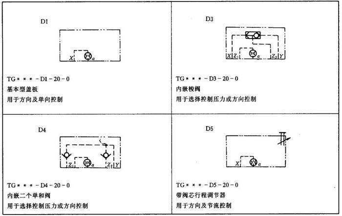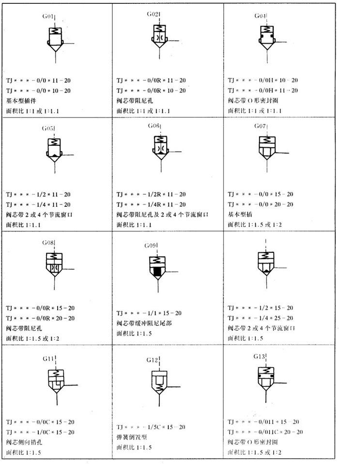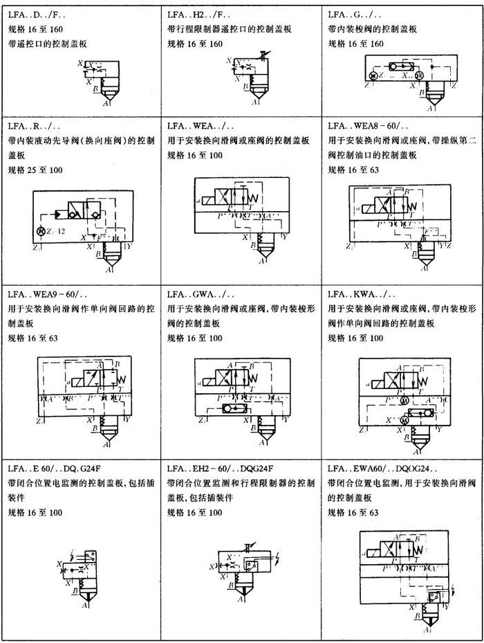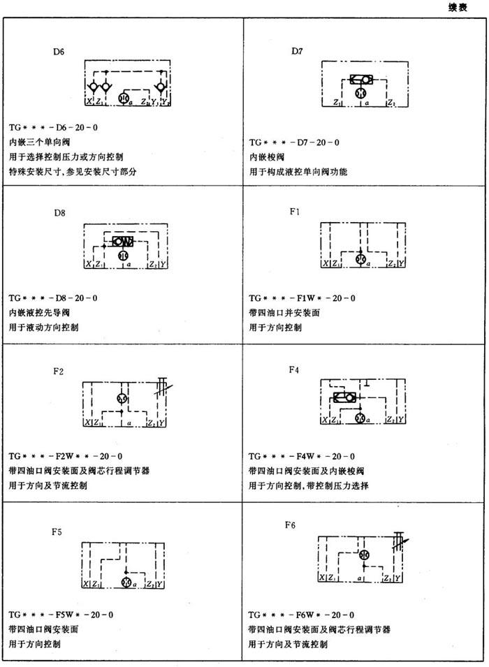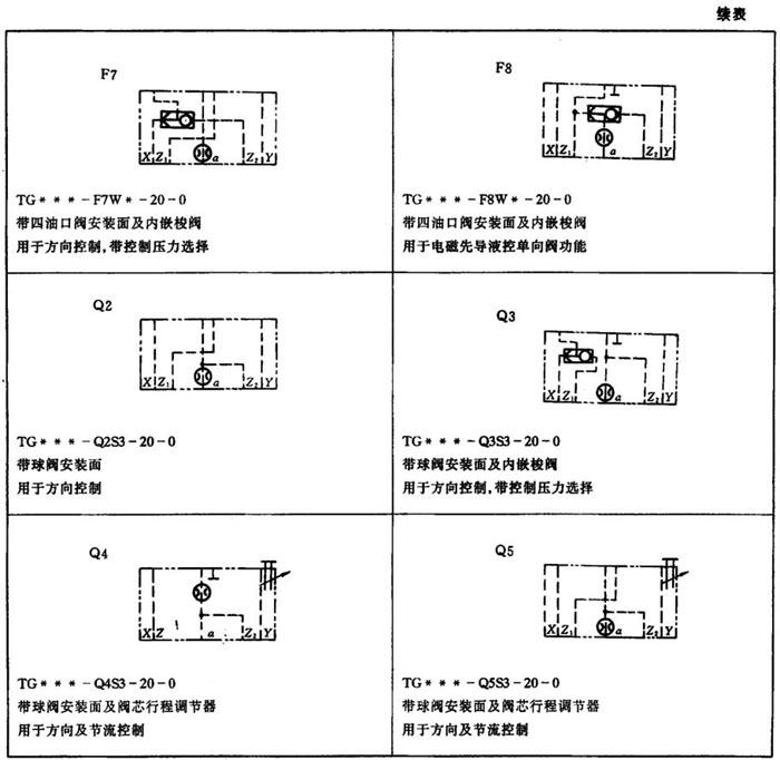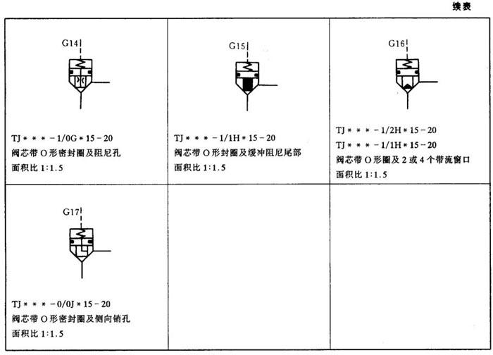 释义 | 插装式方向流量阀 (1)北京液压件厂生产的力士乐系列方向流量阀 A.方向流量阀型号说明 (A)LC型插装件型号说明(方向流量阀) (B)LFA控制盖板符号(方向流量阀)见表19.5-34。 表19.5-34 LFA控制盖板符号 C.性能参数 a.介质 见表19.5-12。 b.LC型插装件工作压力 最高工作压力42MPa c.LC型插装件流量 见表19.5-35。 表19.5-35 LC型插装件流量 D.方向流量阀外形及安装尺寸(LC型插装件) (A)外形尺寸 见表19.5-36。 表19.5-36 方向流量阀(LFA型控制盖板)外形尺寸 单位:mm (B)安装尺寸 16~100通径见表19.5-16,125和60通径见表19.5-37。 表19.5-37 方向流量阀安装尺寸(FC型插装件) 单位:mm (2)七〇四所插装式方向流量阀 A.型号说明 (A)TJ型插装件(方向流量阀)型号说明 ❶ 名称:插装件 ❷ 通径:见表19.5-17 ❸ 阀套型式 0——标准型(与无尾部阀芯配合的阀套) 1——与带尾部结构阀芯配合的阀套 3——减压阀型 5——弹簧倒置型 ❹ 阀芯型式主代号 0——标准型(无尾部) 1——带锥型缓冲阻尼尾部 2——带双节流窗口尾部 3——减压阀型 4——带回节流窗口尾部 5——弹簧倒置型 ❺ 阀芯型式辅助代号 (无)——标准型 C——侧向钻孔型(单向阀用) G——带底部阻尼孔及O形密封圈 H——带O形密封圈 J——带O形密封圈及侧向钻孔型 R——带底部阻尼孔型 ❻ 开启压力:见表19.5-18 ❼ 面积比(αA):见表19.5-19 ❽ 设计号:用于更改编号 ❾ 密封型式 (无)——标准型(线密封型) W——面密封型 ❿ 材料 (无)——GCr1或40Cr 1——4Cr13或13Cr13 2——OCr17Ni7Al(沉浸硬化不锈钢)或9Cr18(不锈轴承钢) (B)TG型控制盖板(方向流量阀)型号说明 ❶ 名称:控制盖板 ❷ 通径:见表19.5-17 ❸ 盖板功能 D1——基本型,用于方向及单向控制 D3——内嵌梭阀,用于选择控制压力或控制方向 D4——内嵌两个单向阀,用于选择控制压力或控制方向 D5——带行程调节器用于方向及节流控制 D6——内嵌三个单向阀用于选择控制压力或控制方向 D7——内嵌梭阀用于构成液控单向阀 D8——内嵌液控先导阀用于液控换向 F1或F5——带回油口阀安装面用于方向控制 F2或F6——带回油口阀安装面用于方向及节流控制 F4或F7——带回油口阀安装面用于方向控制或压力控制的选择 F8——带回油口阀安装面及内嵌梭阀用于电磁先导液控单向阀 Q2——带球阀安装面用于方向控制 Q3——带球阀安装面及内嵌梭阀用于方向控制且带压力选择 Q4或Q5——带球阀安装面及行程调节器用于方向及节流控制 ❹ 先导换向阀型式 W——滑阀式电磁换向阀 S——球阀式电磁换向阀 (无)——无换向阀 ❺ 先导换向阀规格 3——通径NG6(ISO4401-3) 5——通径NG10(ISO4401-5) (无)——无换向阀 ❻ 调节形式 A——手轮调节器 B——带锁螺母 C——千分尺结构 D——带锁千分尺结构 (无)——无调节机构 ❼ 压力级:见表19.5-20 ❽ 介质 (无)——矿物油基工作液 W——水基工作液 ❾ 设计号:用于更改编号 ❿ 零件号 B.符号 (A)TJ型插装件符号(方向流量阀) 见表19.5-38。 表19.5-38 TJ型插装件符号(方向流量阀) (B)TG型控制盖板符号(方向流量阀) 见表19.5-39。 表19.5-39 方向控制盖板符号 C.性能参数 (A)介质要求 介质类别:矿物油;水一乙二醇;油包水或水包油;乳化液 温度范围:-20~70℃ 粘度范围:13~380mm2/s 过滤精度:25μm (B)TJ型插装件流量 见表19.5-23。 (C)TJ型插装件工作压力 最高工作压力为31.5MPa C.方向流量阀外形及安装尺寸(TJ型插装件) (A)外形 见表19.5-40。 表19.5-40 方向流量插装阀外形尺寸(TG型控制盖板) (B)安装尺寸 16~160通径见表19.5-29,125和160通径安装尺寸见表19.5-38。 |