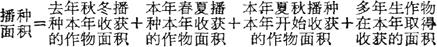 指对耕地及其他农业用地上实际播种或移植有农作物并预计可以取得产品的面积进行统计。 一般在播种季节结束后进行。 播种面积指种植有农作物并在调查时实际成活的面积,不论种在耕地还是非耕地都应计算,但不包括其中栽植果树、茶树、桑树及其他林木所占用的面积,也不包括调查前已经成片死亡和因基建或其他原因占地而被毁掉的面积。 需要移植的作物,如水稻、烟叶等,只计算移植后的面积,不包括原来的秧田面积。过去种植的多年生作物如苎麻、苜蓿、大黄等,以当年实际留存的面积作为播种面积。 播种面积表明农作物的生产规模,是计算农作物产量,研究各作物的构成及其比例关系的依据之一。 在一块土地上种植两种以上作物时,应分别情况统计播种面积: (一)在一块土地上同时间种或混种两种以上作物,若彼此互有影响,同单种产量有很大差别时,每种作物的播种面积按其实际占地比例计算。 若基本上只是一种作物,另种作物所占比例很小,则这块地只算做主要作物的播种面积,另种作物可不计算播种面积。 (二)在一块土地上先后套种两种作物,其共同生长期比较短,彼此影响很小或无影响,每种作物的播种面积均按该块土地面积计算。 若共同生长期比较长,则按间种或混种的计算方法处理。 播种面积是分别不同季节计算的。计算一个年度的播种面积,一般以本日历年度内能收获产品的作物面积为准,即包括去年秋冬播的作物面积、本年春夏播的作物面积和夏秋播的作物面积,以及多年生作物在本年取得收获的面积。本年秋冬播的将在明年收获的面积,不计算在内。 至于有些作物,如甘蔗,有的地方本年冬季开始收割,至下年春收割完毕,其播种面积仍计算在本年内。本年播种面积的计算公式如下: