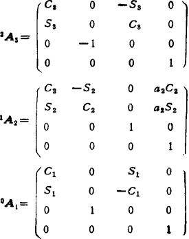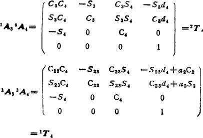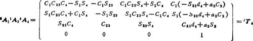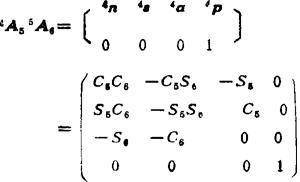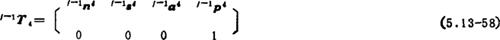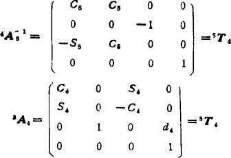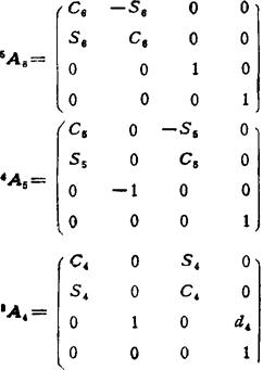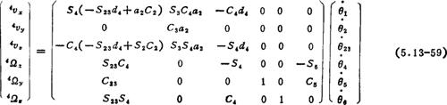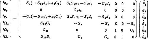 释义 | 操作手的雅可比矩阵 (Jacobian) 操作手运动学的正问题和逆问题,从正反二方面研究了关节状态矢量与末端装置的位置与方位之间的关系。在运动控制中,尚需确定关节的无穷小运动在末端装置位置与方位无穷小变化之间的关系。在无穷小关节运动与无穷小末端装置运动之间存在一线性关系。这一关系可用雅可比矩阵定义。若设末端装置的微小移动和微小转动为d和δ,则 j关节转动对末端装置角速度Ω的奉献为 (5.13-43) 总起来,如果j关节为转动关节,则 由于关节2和3的轴是平行的,可用1A3=1A22A3代替1A3和 从以上各式中即可得到式(5.13-53)和(5.13-54)的各变量。因为 由(5.13-53)式计算操作手雅可比矩阵各列,得 雅可比矩阵元素中有重复项,上式等价于 式中θ23=θ2+θ3。由(5.13-57)式计算4n、4a4a和4p,得 由(5.13-56)式得 6vy=-C5S64v2-S5S64vy-C64v2 6v2=-S54vx+C54vy 6Ωx=C5C64Ω2+S5C64Ωy-S64Ω2 6Ωy=-C5S6'Ω2-S5S64Ωy-C64Ω2 6Ω2=-S54Ωx+C54Ωy 计算4J只需11次乘法运算和3次加法运算;求4v和4Ω需要16次乘法运算和12次加法运算;求6v和6Ω需要20次乘法运算和10次加法运算。总数分别为47次和25次。 |